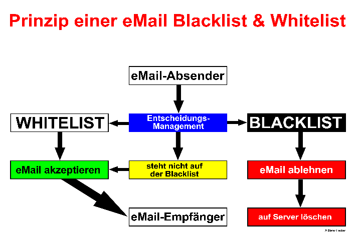 Hingegen ist eine Blacklist, genau das umgekehrte von einer Whitelist. Hier sind ausschließlich nur solche Mailadressen und Domains aufgelistet, die eindeutig und mehrfach als unerwünschter AbsenderIN von Mails in Erscheinung trat. Manchmal ist es am sinnvollsten eine ganze Domain auf diese Liste zu setzen, anstatt in mühsamer Arbeit jede einzelne Mailadresse einzufügen. Oftmals klingen diese Mailadressen sehr ähnlich und man hat einen Buchstaben, ein Zeichen nur geändert.